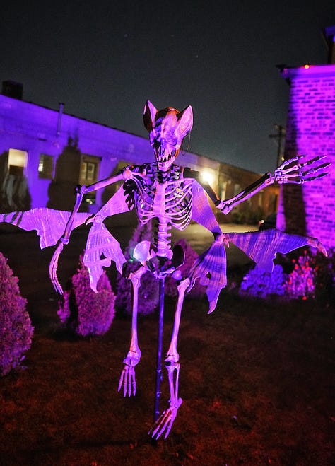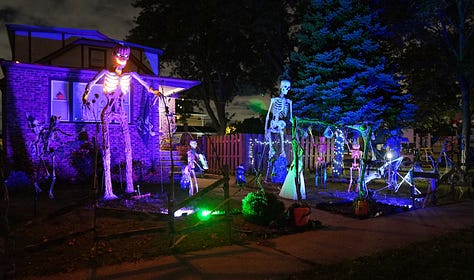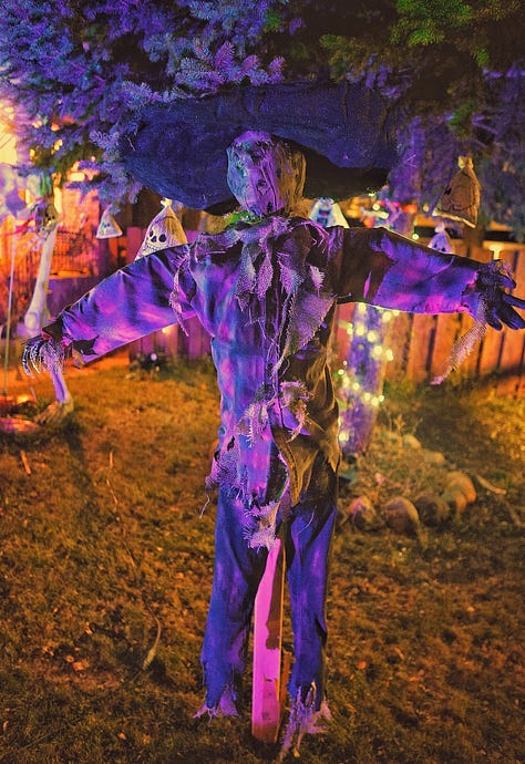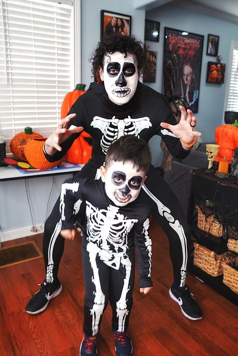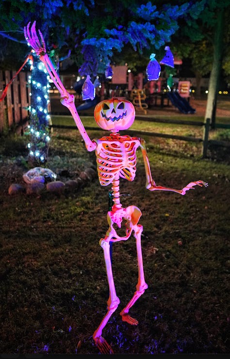 October is my favorite kind of chaos. Leaves start changing colors, haunted houses are opening, and the air finally has that little chill that makes you want to light a candle and watch scary movies. Everywhere you look, Halloween decorations are creeping up around the neighborhood, and it just feels like magic. And in our house, it brings us pure joy. Our front yard is filled with decorations, handmade by Armando.