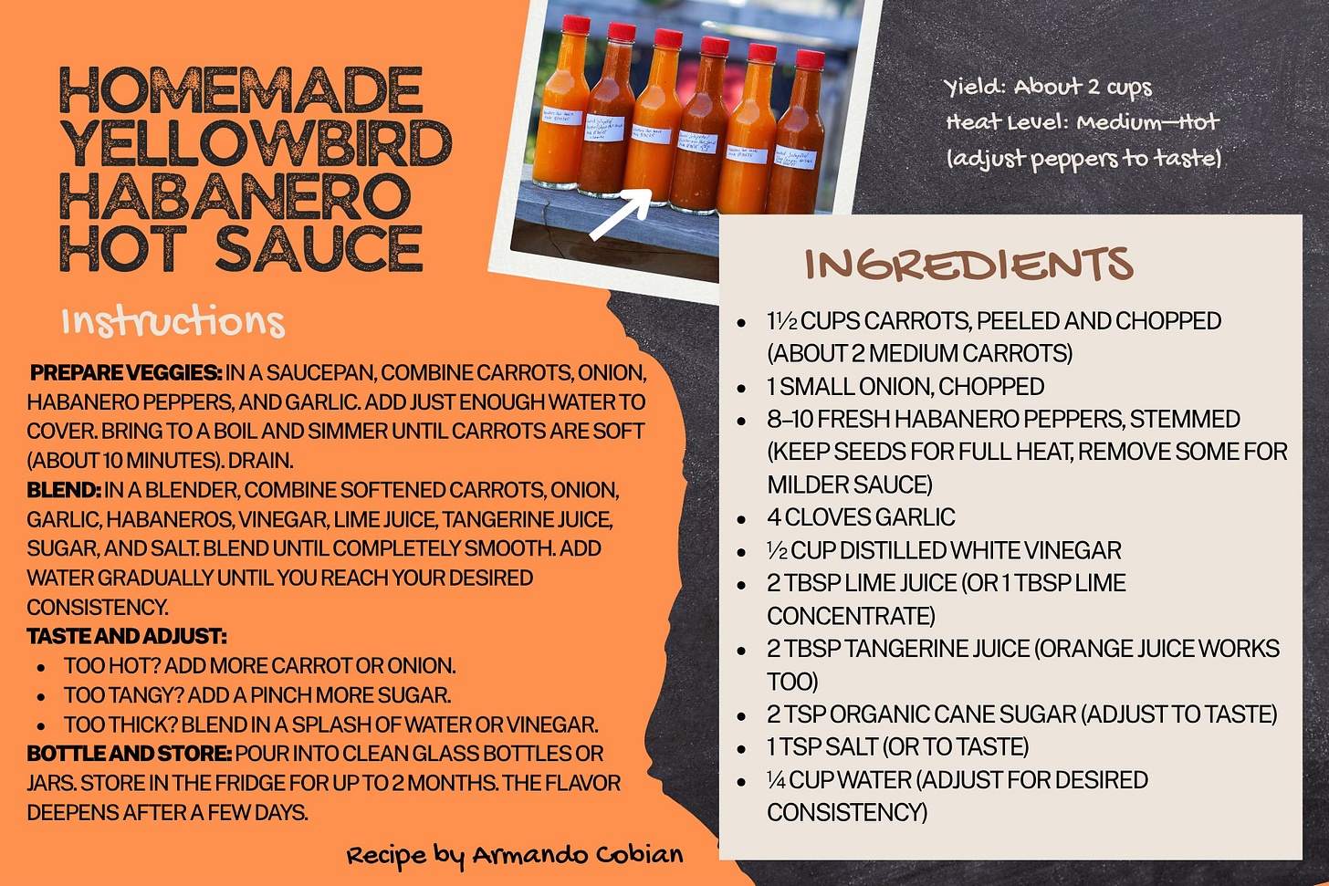This month’s extra is a little fiery. Armando’s homemade Yellowbird-style hot sauce has become a favorite in our house. It’s sweet, spicy, and dangerously addictive. It’s the perfect mix of heat and flavor.